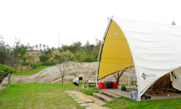 글램핑장에는 대형견을 동반할 수 있으며, 개별 울타리가 있어 독립적인 공간사용이 가능해요.
