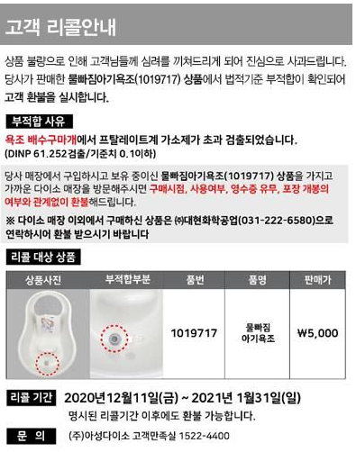 매장 이외에서 다이소 아기욕조 환불 리콜을 하려면 (주)대한화학공업(031-222-6580)