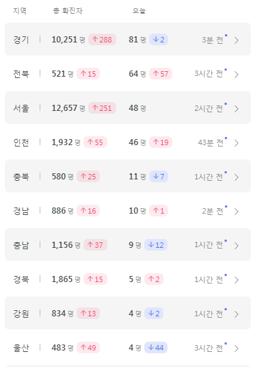 실시간으로 전국 지표를 확인해 볼 수있고 어제 대비 현황을 볼 수있어서
