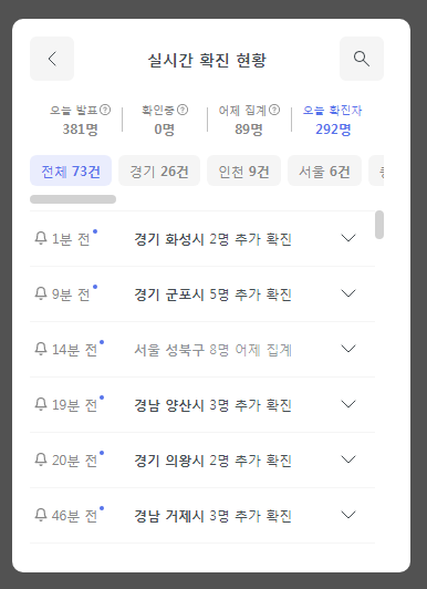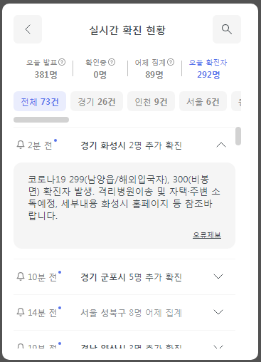 코로나 라이브는 재난문자와 각지자체 및 질병관리청(본부에서 청으로 승격)에서
