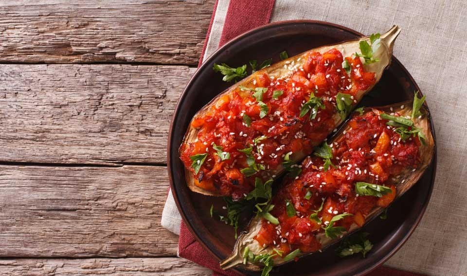 커다란 가지를 반으로 잘라 토마토, 양파, 마늘 등을 각종 향신료와 버무려 올린 뒤 올리브유를 넉넉하게 둘러 굽는다.