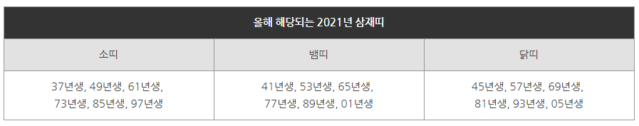 2021년 날삼재띠: 소띠,뱀띠,닭띠