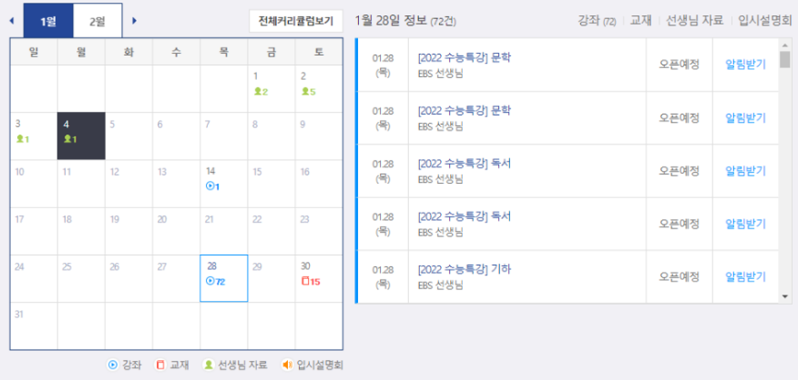 2022수능특강출시일에 맞춰서 함께 진행 되는 22수능특강인강개강일은 1월 28일로 예정이 되어 있습니다. 자세한 사항은 EBS홈페이지에서 확인 해 볼 수 있습니다. 이뤄 미뤄 짐작해 봤을때 1월 28일이 수능특강인강개강일이니 수능특강은 28일 이전에 출시 되지 않을까 싶습니다.