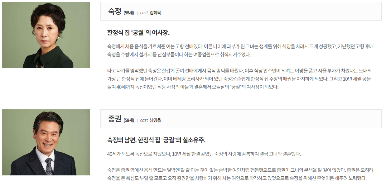 영신과 밥집, 그리고 궁궐에서의 이야기를 다루지만 그 안에서 벌어지는 다양한 사건사고들이 있을 것으로 예상이 되는바. 등장인물 관계도를 살펴보면 영신, 다정, 정훈, 오복은 친구사이 입니다. 경수는 영신을 동생처럼 길러왔으며, 경수의 숙적은 종권의 아내이자 한식집 궁궐 사장인 숙정(김혜옥)이며, 한식 조리사 성찬(이루)은 숙정의 조카입니다.