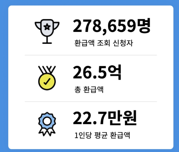 삼쩜삼은 스타트업 회사에서 만들었는데 AI 세무회계 플랫폼 스타트업 자비스앤빌런즈는 삼쩜삼을 통해서 최근 5년간 미수령 환급금을 조회하고 이를 환급받을 수 있는 온라인 서비스 입니다. 삼쩜삼은 지난해 12월 21일 기준 총 48만1362명이 환급액 조회를 신청을 했는데 그 금액만 무려 총 78억2000만원!! 그동안 국민들이 내고도 받아가지 못한 세금이 아주 어마어마 하죠??? 1인당 평균 환급액은 16만3만원이라고 하니 어서 내가 받을 세금 받아 가시면 좋을 것 같아요!