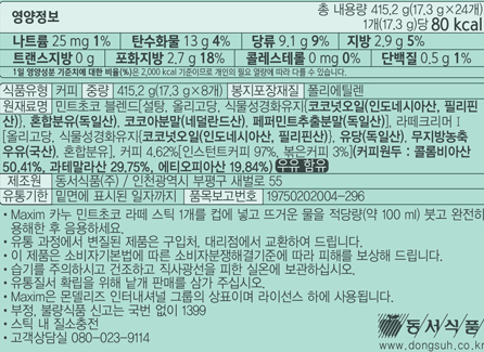 | 커피4.62%, 무지방농축우유 5.46%, 코코아분말 1.1%, 페퍼민트추출분말 0.03% |