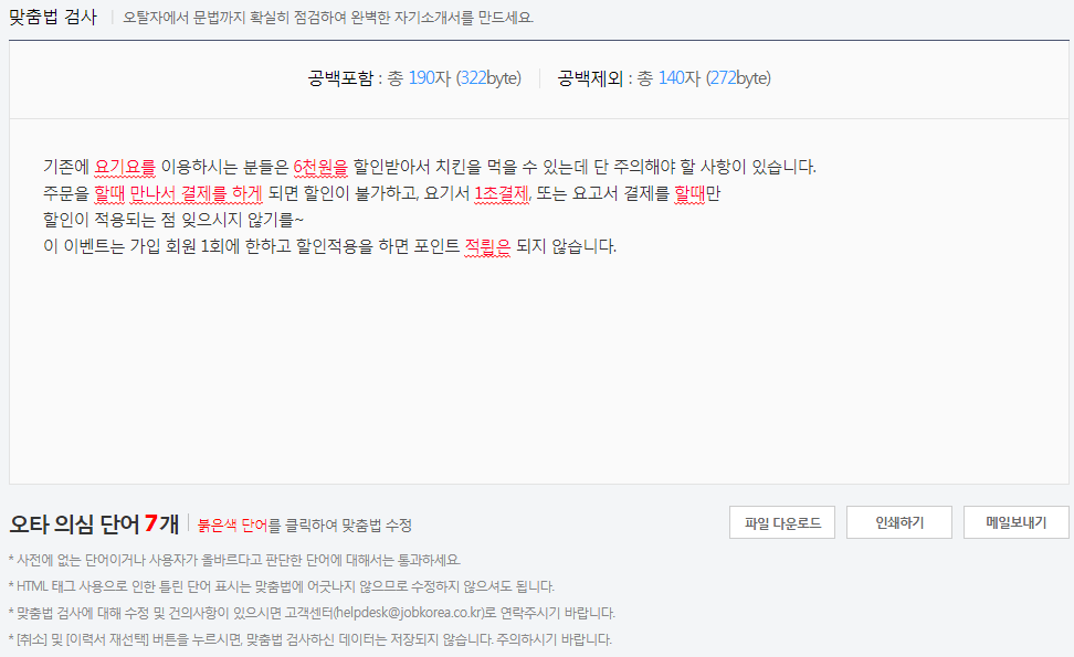 부산대맞춤법검사기는 글자수 제한이 있어서 약간 사용이 불편한 감이 있지만 잡코리아는 글자수 제한이 없으니 편학 사용을 할 수가 있습니다.