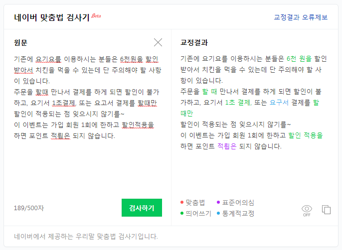 맞춤법만 알려주는게 아니라 띄워쓰기랑 전체적으로 다 검사를 해주면서 어디 부분이 틀렸는지도 자세히 알려주니