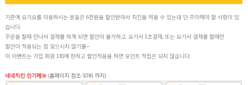 | 네네치킨 요기요 6천원 할인 받는법 (0) | 2021.01.23 |