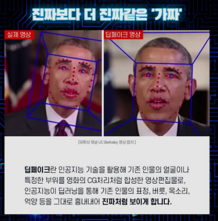 온라인상에서 유행을 하고 있는 딥페이크는(deepfake) 인공지능 기술을 활용해서 기존에 있던 인물을