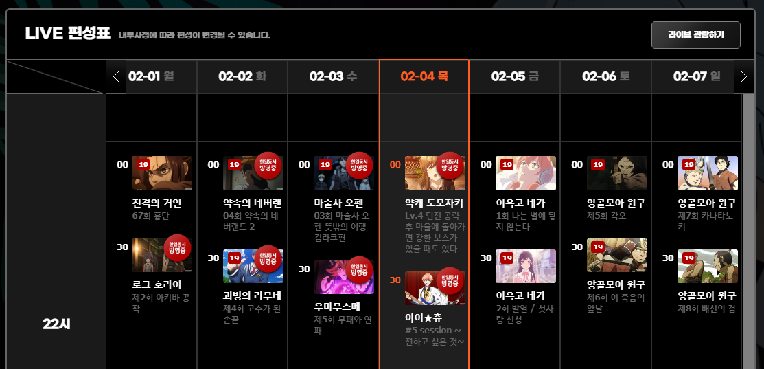 특히나 애니플러스 편성표를 보면 야간대의 방송은 매우 수위가 높은 것들이 많이 있죠~