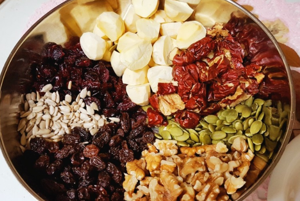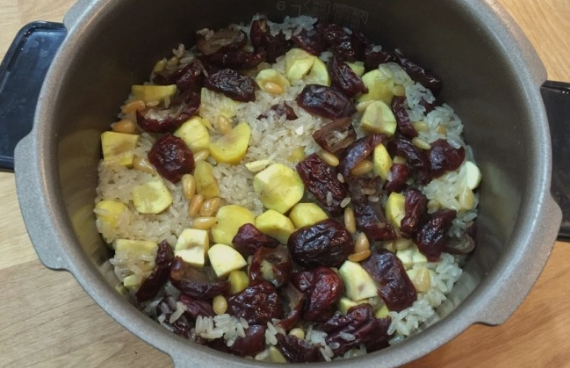 미리 불려놓은 찹쌀 500g, 손질한 밤 15개, 볶은 호두·볶은 호박씨 각 100g, 볶은 은행 20개를 넣어주세요