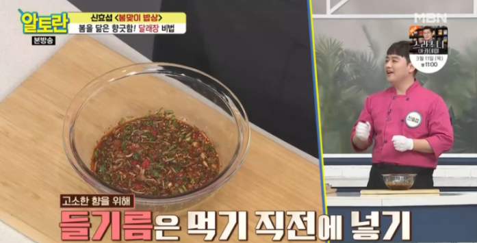 특유의 고소함을 더 높이기 위해서 달래장만들기가 끝이난 후에 먹기직전에 들기름 2 큰 술을 넣어주세요