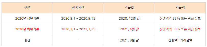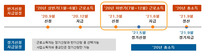상반기(1월∼6월) 근로소득에 대해 9월에 신청하면 12월에 지급받을 수 있고, 하반기(7월∼12월) 근로소득은 다음해 3월에 신청하면 같은 해 6월에 지급 받습니다.