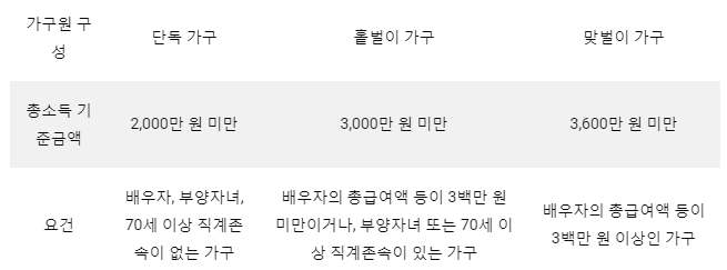 단독가구는 배우자, 부양자녀, 70세 이상 직계존속이 없는 가구 중 총소득 기준금액 2,000만 원 미만