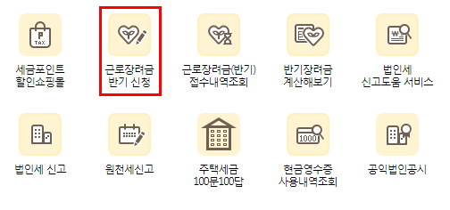 | 국세청홈택스 로그인 → 신청·제출 → 근로장려금 반기신청 → 일반신청하기 → 신청요건 확인 → 인적사항 작성 → 소득명세 작성 → 신청자격 확인 → 계좌번호·연락처 입력 → 신청확인 및 전송 → 접수증 출력 |