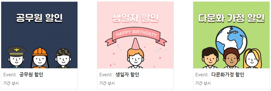 경로우대, 임산부 할인, 공무원 할인, 생일자 할인, 다문화 가정 할인, 세자녀 가정 할인, 창원 시민 할인