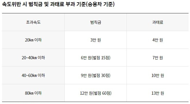 - 초과속도 60KM/h 이하 / 범칙금 12만원(벌점 60점) / 과태료 13만원