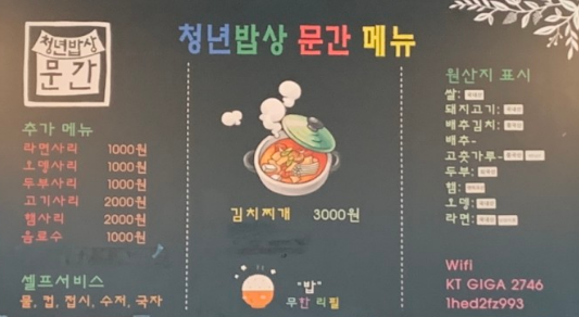 메뉴 : 김치찌개(3,000원), 밥 무한리필, 추가(라면사리, 오뎅사리 등)
