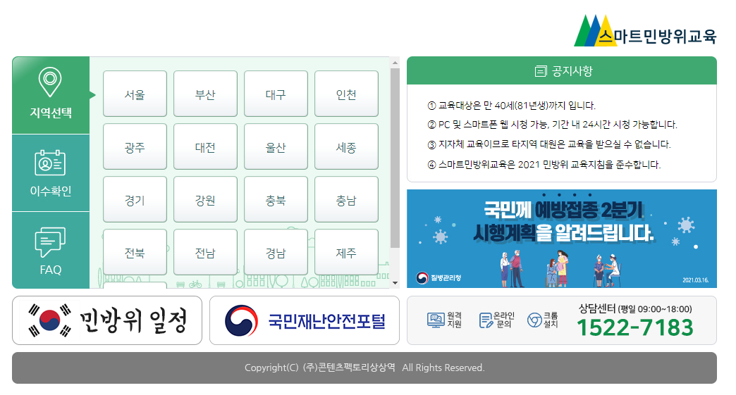 전국 지자체별 민방위 사이버교육, 5년차 이상 사이버민방위, 민방위 온라인 교육훈련 일정 조회 확인, 스마트 러닝 제공, 온라인 문의