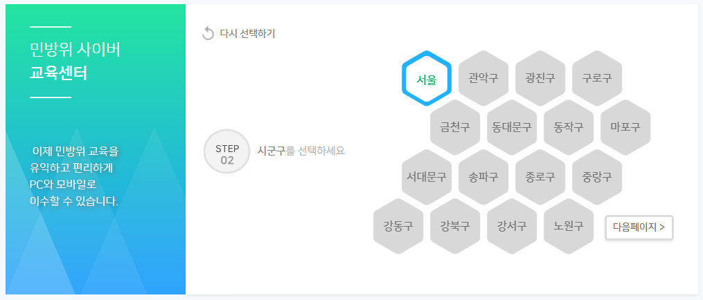 민방위 사이버 교육은 관할 지자체 교육이기 때문에 타지역의 민방위 대원은 교육을 받을 수 없습니다. 본인의 관할 민방위 구역 지자체에 문의하여 교육 안내를 받으세요