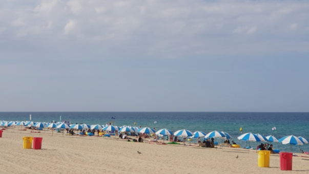 푸르게 빛나는 동해 바다의 수평선이 드넓게 펼쳐진 해수욕장은