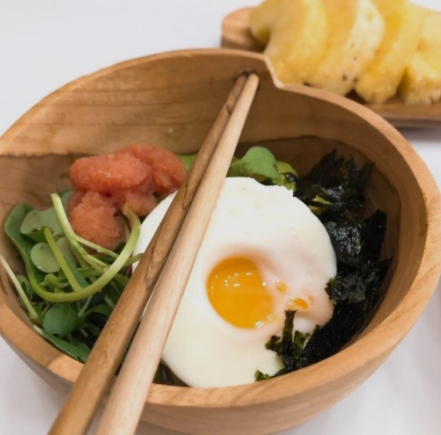 5. 밥 위에 아보카도, 명란젓, 베이컨, 양상추, 새싹채소, 계란후라이 올리기