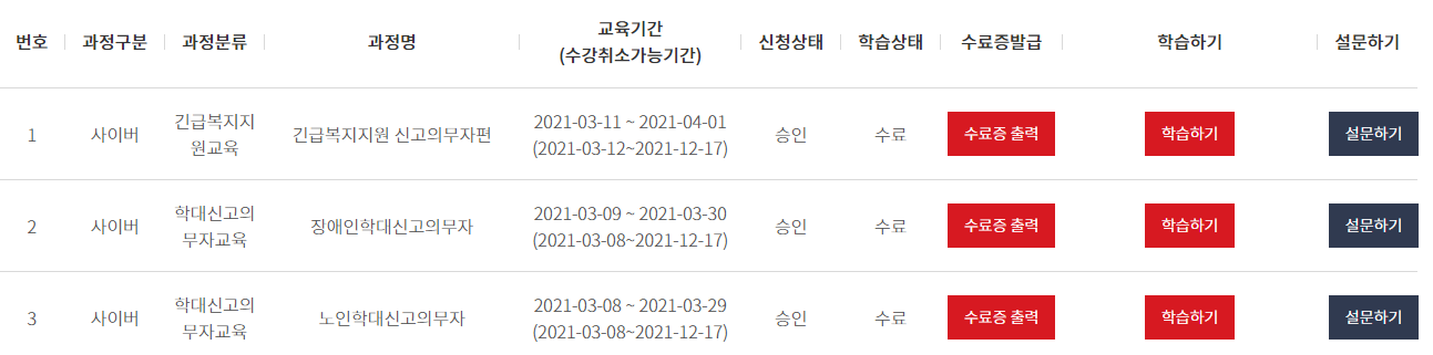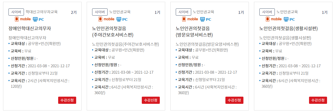 교육을 받고자 하는 교육 과정을 클릭하거나 과정신청을 누르게 되면 사이버로 수강할 수 있는 교육이 생생이 됩니다.