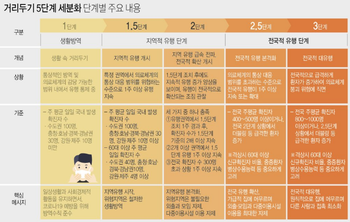 생활방역(1단계), 지역유행(1.5, 2단계), 전국유행(2.5, 3단계)로 나뉘었는데 세분화해 1.5, 2.5단계가 설정이되어쓰며