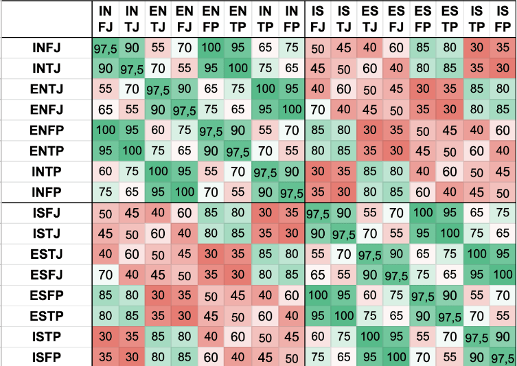 위의 표를 확인하게 되면 진한 녹색이 될수록 좋은 궁합의 점수를 보이며 빨간색이 진하게 될수록 나쁜 궁합으로 확인을 해 볼 수 있습니다.