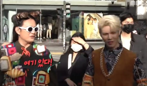 원흠은 식빵을 뚫어서 만든 체인과 바게트 총을 들고 나왔는데 그 모습이 역시나 개그듀오 그룹 다운 면모를 보여줍니다.